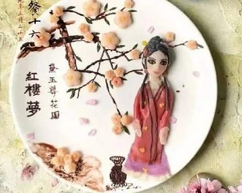 而接下來這盤更是創(chuàng)意十足,不少網(wǎng)友看了更是直呼:畫面太美,都不忍心下嘴了。盤中人不就是紅樓中的經(jīng)典人物林黛玉嗎?