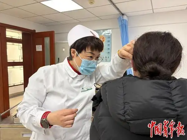 北京中醫(yī)醫(yī)院,護(hù)士正給一個(gè)00后年輕人埋耳豆。中青報(bào)·中青網(wǎng)記者 劉昶榮/攝