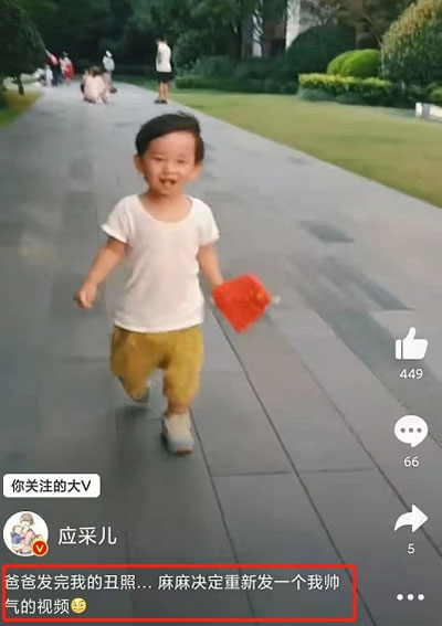 可能是因?yàn)閼?yīng)采兒實(shí)在信不過(guò)老公的拍照技術(shù),在陳小春更新完動(dòng)態(tài)后不久,應(yīng)采兒就在自己的社交平臺(tái)上分享了小兒子的生活動(dòng)態(tài),并且配文:“爸爸發(fā)完我的丑照… 麻麻決定重新發(fā)一個(gè)我?guī)洑獾囊曨l。”