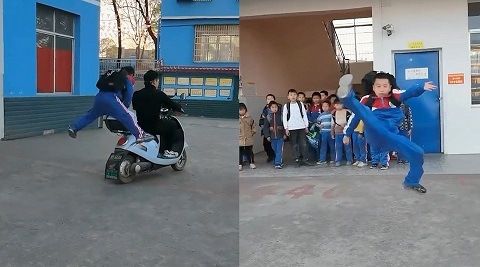 1月12日,湖南永州,一名小學(xué)生放學(xué)在同學(xué)面前展示打拳動作,行云流水,最終跳上電瓶車,這一套拳腳不僅驚呆了他身后的同學(xué),即便我們這些不懂武術(shù)的人也看的賞心悅目,尤其最后翻跳上電動車的一幕,簡直帥到?jīng)]有朋友了。