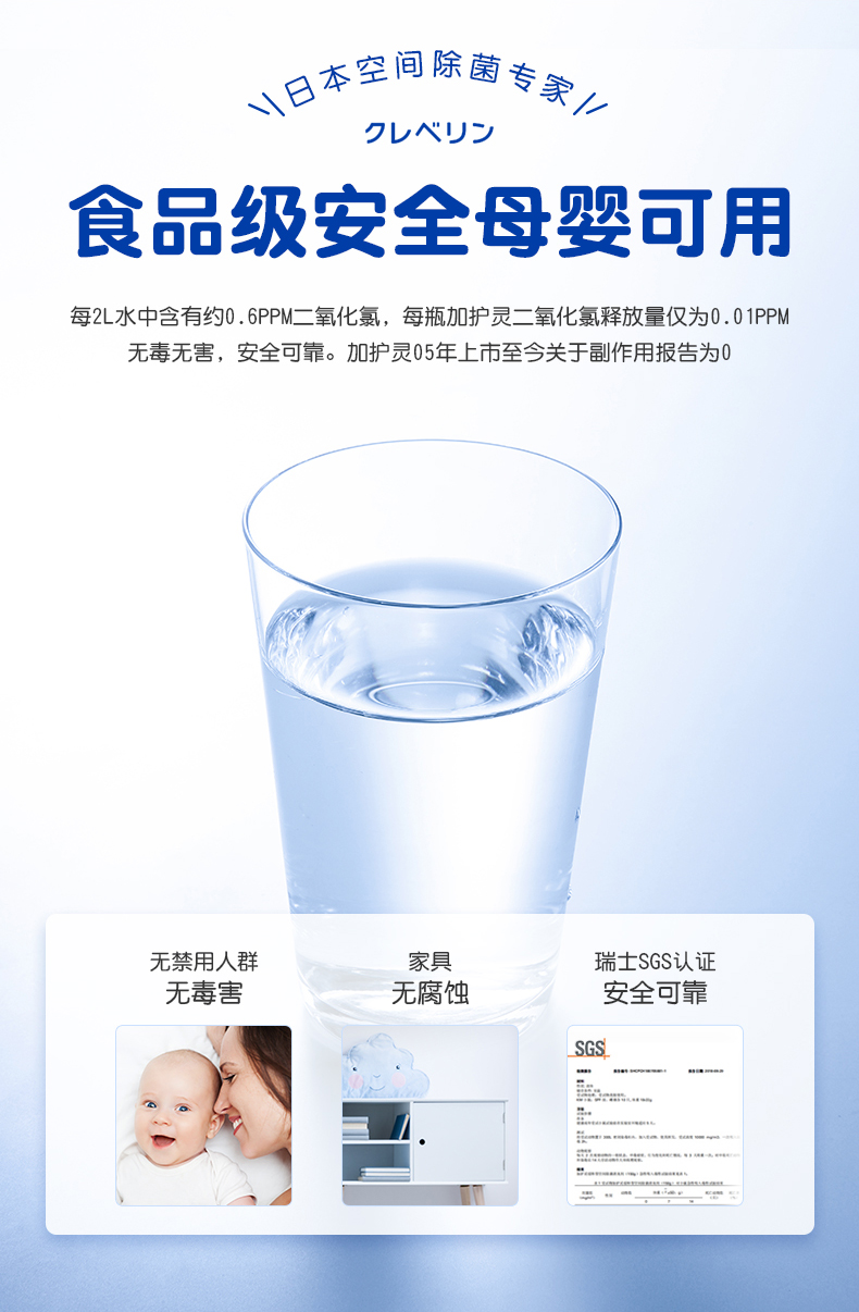 要為寶寶提供服務(wù),安全性自然首當(dāng)其沖。加護(hù)靈的主要成分二氧化氯是國(guó)際公認(rèn)的廣譜高效的氧化性消毒劑,被廣泛應(yīng)用于醫(yī)學(xué)、食品、飲用水等領(lǐng)域,對(duì)人體無毒無害,老人孩子都可以放心使用。在除菌過程中,加護(hù)靈采用國(guó)際先進(jìn)的緩釋技術(shù)勻速釋放二氧化氯,并將釋放濃度控制在0.01ppm,遠(yuǎn)低于我們喝水?dāng)z入二氧化氯濃度0.6ppm的標(biāo)準(zhǔn)。此外,加護(hù)靈還會(huì)將細(xì)菌、病毒、甲醛等空間污染物徹底分解為水和二氧化碳,并不會(huì)有任何氯化物殘留,整個(gè)消殺過程安全無害。