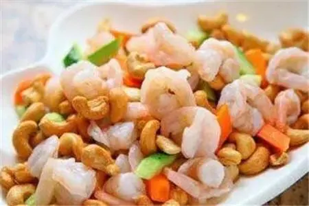 第二步,將腰果直接下鍋炒熟了,大蝦處理成蝦仁,加料酒和白胡椒粉以及鹽攪拌。