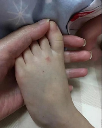 從家長發(fā)布的照片來看,孩子腳部和面部下側(cè)均有針孔,被扎原因只是因為孩子中午不睡覺。