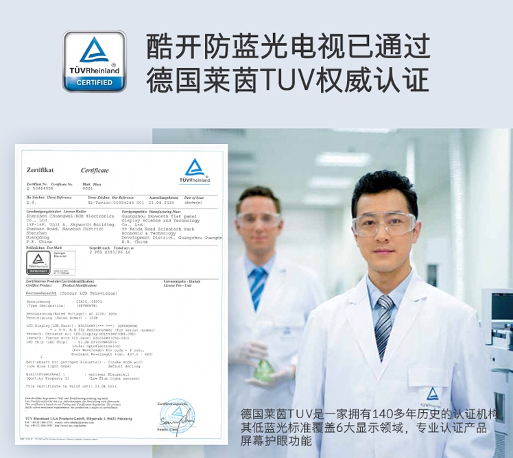 酷開的光學(xué)防藍(lán)光技術(shù)也是首家獲得德國權(quán)威檢測機(jī)構(gòu)TÜV(德國萊茵)認(rèn)證的,更加值得信賴。成熟可靠的防藍(lán)光技術(shù),充分解決了“更好的電視教育”和“保護(hù)孩子視力”二者不可兼得的難題,讓孩子在有效學(xué)習(xí)的同時,降低屏幕對眼睛造成的傷害。