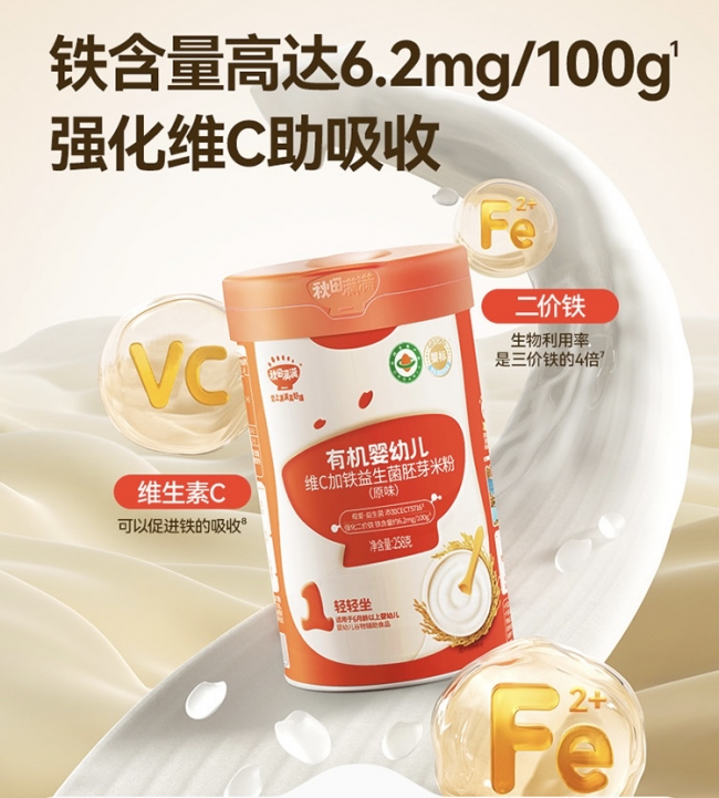 米粉產(chǎn)品中鐵元素優(yōu)選二價(jià)鐵,秋田滿滿營(yíng)養(yǎng)元素中二價(jià)鐵含量高達(dá)6.2mg/100g,產(chǎn)品發(fā)布時(shí)為業(yè)內(nèi)“鐵含量”天花板。