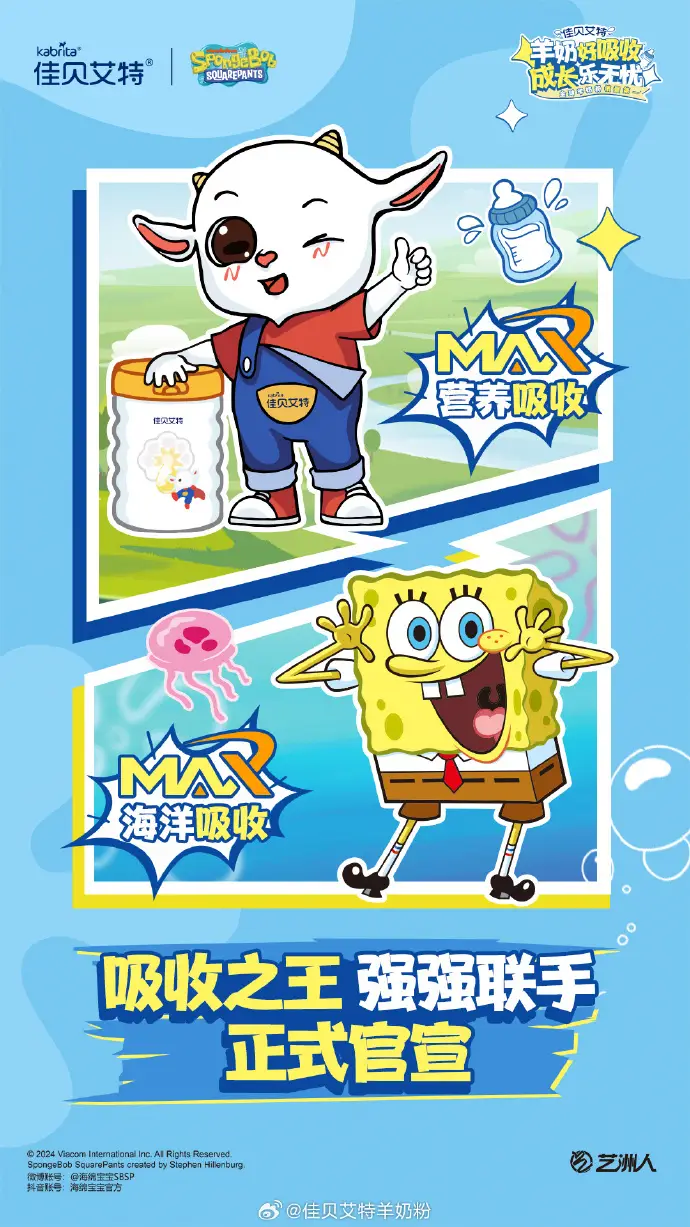 正如本次跨界合作主題“羊奶好吸收,成長(zhǎng)樂(lè)無(wú)憂”,海綿寶寶在觀眾心目中,長(zhǎng)期保持著快樂(lè)向上的可愛角色形象;而當(dāng)代父母育兒觀念也發(fā)生了改變,在關(guān)注寶寶營(yíng)養(yǎng)好身體棒棒同時(shí),育兒主打一個(gè)快樂(lè)松弛;兩者與佳貝艾特所倡導(dǎo)的快樂(lè)育兒的理念不謀而合,旨在通過(guò)“吸收好,營(yíng)養(yǎng)更好”的羊奶粉幫助孩子健康快樂(lè)成長(zhǎng)。