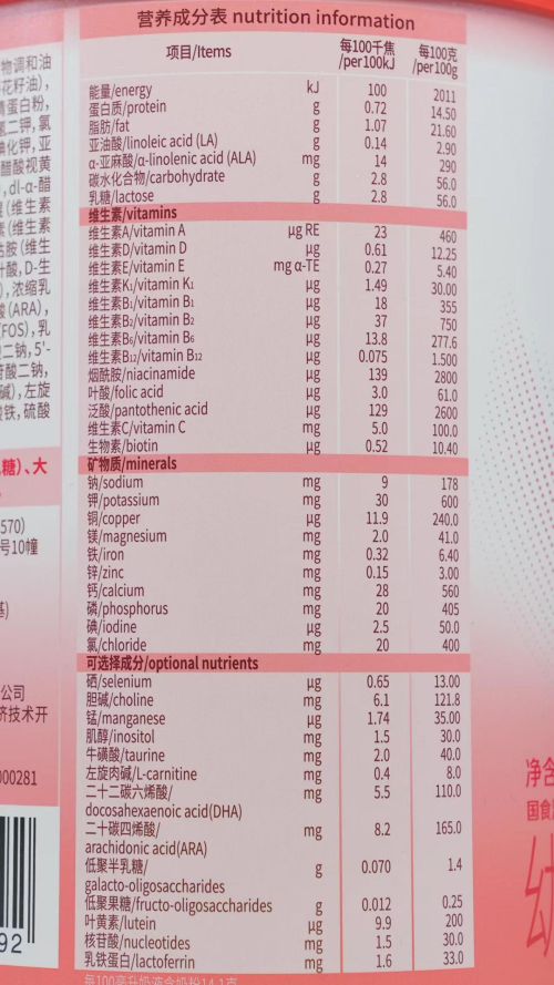 在腦視力營養(yǎng)方面,貝因美愛加添加了DHA、ARA、葉黃素、?;撬幔憠A等營養(yǎng)成分。其中DHA含量為110mg/100g,ARA含量為165mg/100g,研究表明,DHA和ARA對(duì)于促進(jìn)嬰兒早期神經(jīng)系統(tǒng)和視覺功能的發(fā)育有重要作用。葉黃素含量為200μg/100g,葉黃素是人體視網(wǎng)膜的重要物質(zhì),對(duì)于保護(hù)眼睛健康非常重要。