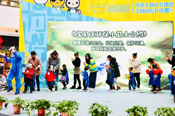 啟動儀式現場,寶貝王成長課程老師和現場的小朋友及家長們,一起體驗了一堂關于環(huán)保小衛(wèi)士的兒童主題成長課程DEMO課。通過觀看環(huán)境破壞的圖片,激發(fā)小朋友熱愛自然的同理心,了解環(huán)境對身體健康的影響,以及如何保護環(huán)境衛(wèi)生健康;同時通過保護地球藝術創(chuàng)作,創(chuàng)意拼貼、藝術涂鴉,一起繪制孩子心中的美好地球,培養(yǎng)孩子的學習、社交、探索等能力;另外澆灌綠植,宣讀環(huán)保公約等環(huán)節(jié),幫助孩子從小樹立環(huán)保意識和社會責任感,提升孩子的解決能力、表達能力等。