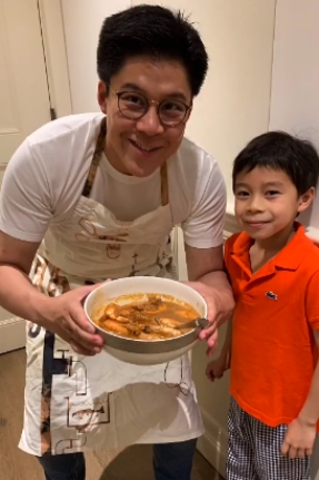 霍啟剛與兒子共同下廚,疫情期間的又一項親子活動