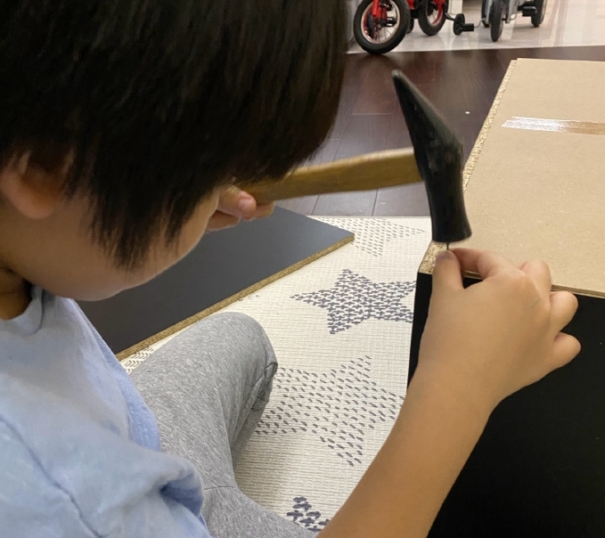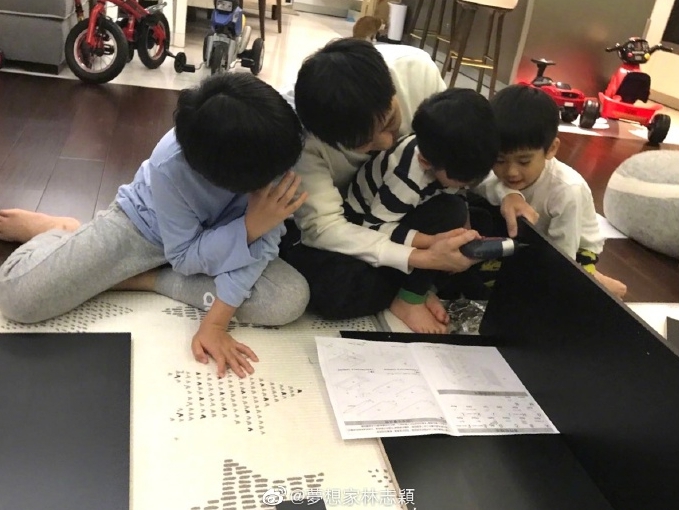 林志穎配文說“三個小幫手一起組裝鞋柜,弟弟們鎖螺絲,哥哥練習錘釘子,最終完成了,但多出了些螺絲跟釘子,這鞋柜應該牢靠吧。”