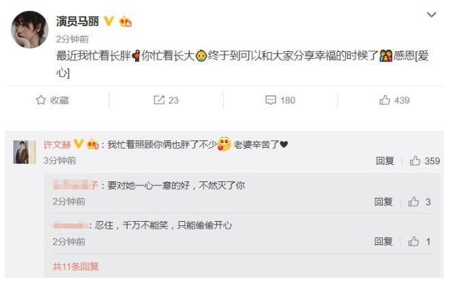 去年12月1日,演員馬麗在社交平臺上發(fā)文官宣了懷孕的好消息,配文寫道:“最近我忙著長胖,你忙著長大,終于到可以和大家分享幸福的時候了感恩”老公許文赫也是親切的回復(fù)了自己的妻子,雙方顯得非常恩愛。雖然已經(jīng)懷孕,馬麗都沒能放下自己的工作,甚至孕期還登上春晚舞臺。
