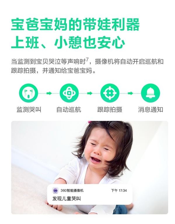 此外,360智能攝像機(jī)云臺(tái)5P觸聯(lián)2K版還增加了哭聲智能監(jiān)測。當(dāng)孩子哭泣時(shí),攝像機(jī)自動(dòng)打開巡航和跟蹤拍攝功能,并在第一時(shí)間通知寶爸寶媽。如果家長不能第一時(shí)間出現(xiàn)在孩子身邊,家長還可通過手機(jī)APP為孩子挑選播放兒歌、故事等內(nèi)容,安撫孩子情緒。