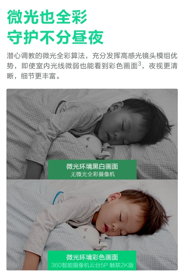 有了這款“看娃神器”,家長們想趁著孩子睡覺的功夫去客廳、廚房打理一下家務(wù),也不用再懸著一顆心了,通過手機(jī)APP就能隨時(shí)看到孩子的具體狀況。360智能攝像機(jī)云臺(tái)5P觸聯(lián)2K版具備300萬高清攝像頭和微光全彩夜視能力,畫質(zhì)達(dá)到了2K旗艦水平,夜視更清晰,細(xì)節(jié)更豐富,讓寶寶的一切動(dòng)態(tài)盡在掌控之中。