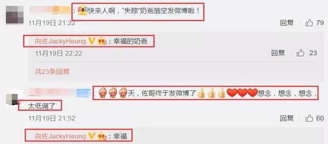 向佐在評論區(qū)與網(wǎng)友互動,看得出心情大好,有網(wǎng)友評論:“快來人啊,失蹤奶爸抽空發(fā)微博啦!”向佐回復(fù)評論:“幸福的奶爸”,還有網(wǎng)友評論“奶皇爸多吃點(diǎn),新任爸爸辛苦啦”,向佐也回復(fù)“她比較辛苦”,那這個她不用想了,大家自然就知道是誰了吧,就是指老婆郭碧婷。向佐這樣的回復(fù)這次也成為了公眾們的關(guān)注焦點(diǎn)了。