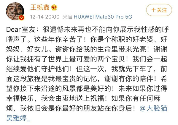 在王櫟鑫的離婚聲明中,王櫟鑫喊吳雅婷為“室友”,這讓不少網友感到費解:不應該稱呼為妻子、親愛的、寶貝之類的嗎?哪怕是個小名也行啊!為什么會是室友呢?