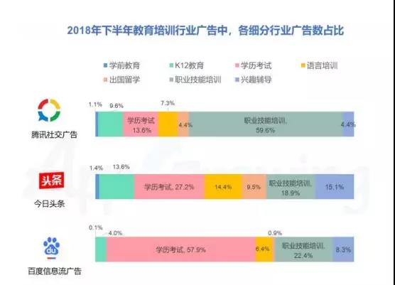 對于早教/學(xué)前教育常見的廣告類型,包括智力開發(fā)(少兒編程)、啟蒙教育(兒歌/英語/識字)、學(xué)前班、早教機構(gòu)、托管機構(gòu)等。統(tǒng)計發(fā)現(xiàn)2018年下半年,學(xué)前教育今日頭條廣告投放占比最高達1.4%,其次為騰訊社交廣告1.1%,以及百度信息流廣告0.1%。其中K12教育今日頭條占比最高達13.6%,學(xué)歷考試百度信息流廣告占比最高57.9%,騰訊社交廣告則是職業(yè)技能培訓(xùn)占比最高達59.6%。