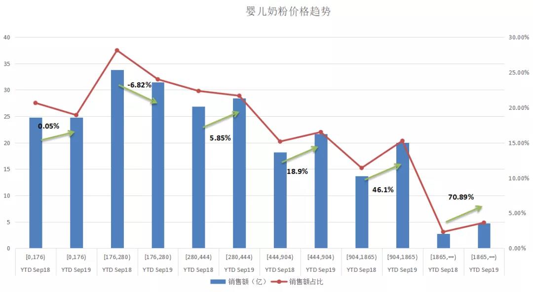 2019年各大奶粉品牌的財報數(shù)據(jù)比較明顯,新生兒出生率下降的情況下,市場規(guī)模一定是在收緊。但從圖中可以看出,高端化、超高端趨勢愈顯,中端奶粉在負(fù)增長,尤其是超高端產(chǎn)品的市場份額、增速都在高速增長??梢姡S著收入水平及健康意識增加,中國居民對產(chǎn)品品質(zhì)要求更高,特別是那些生育家庭更愿意給孩子提供高品質(zhì)產(chǎn)品,這就決定中國嬰幼兒奶粉及輔食在品質(zhì)提升帶來增值方面還有很大提升。而且也可以看出嬰兒奶粉禮盒裝在線上較受歡迎。