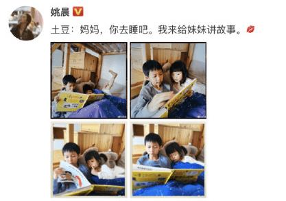 3月13日,姚晨在微博上曬出兒子土豆給妹妹講故事的照片,并配文:“土豆:媽媽,你去睡吧。我來給妹妹講故事。”照片中,土豆拿著故事書,妹妹躺哥哥身邊安心睡著,畫面溫馨有愛。