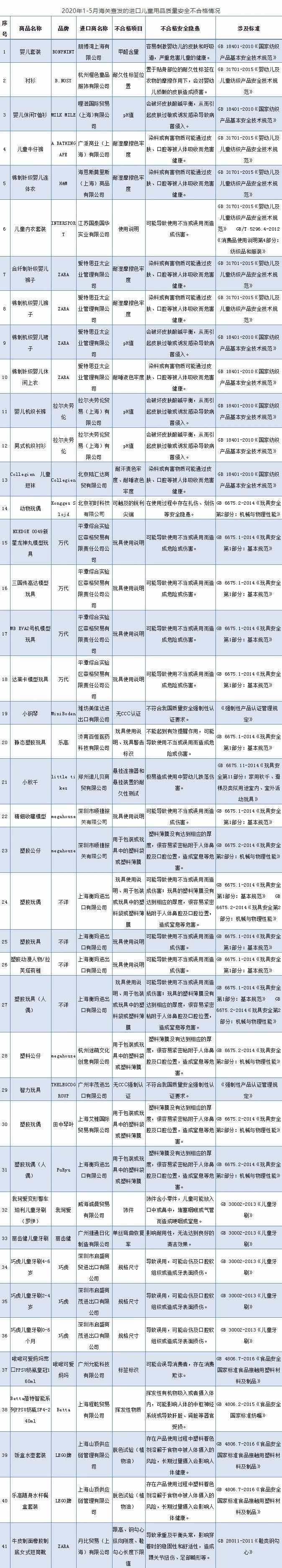 隨著人民生活水平的提高,進口兒童用品越來越受到寶爸寶媽們的青睞,來自世界各地琳瑯滿目的進口兒童用品都是寶爸寶媽眼里的大品牌,據(jù)親貝網(wǎng)小編了解,日前,海關總署對外公布2020年1至5月海關查發(fā)的部分進口兒童用品質量安全不合格情況,涉及服裝、玩具等6類41批次進口兒童用品,包括H&M、ZARA、樂高、巧虎等品牌。