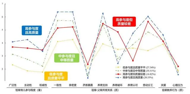 這項(xiàng)研究根據(jù)祖輩參與育兒的程度和質(zhì)量將所調(diào)研的家庭分為四類,包括高參與度且高質(zhì)量組、高參與度但質(zhì)量較差組、中參與度且中等質(zhì)量組、低參與度且質(zhì)量平平組。